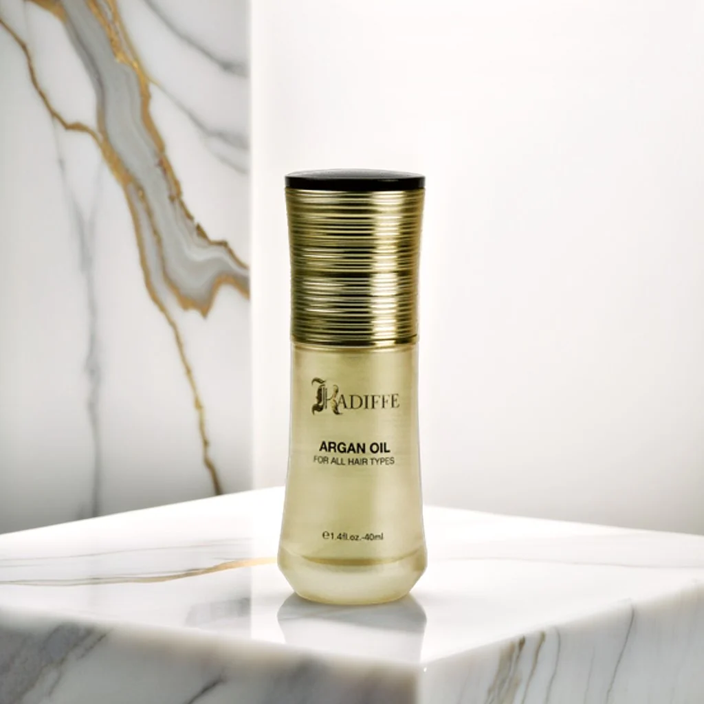 Аргановото масло Kadiffe представлява внимателно подбран микс от масла на арганмакадамия и жожоба, подходящ за всички типове коса. Формулата му осигурява интензивна хидратация и подхранване на косата, оставяйки я мека и блестяща още след първото нанасяне. Леката текстура на маслото позволява бързо абсорбиране без утежняване, осигурявайки еластичност и лесно оформяне на косата. Продуктът е създаден, за да защитава косата от вредните въздействия на околната среда, UV лъчите и топлинната обработка, като едновременно стимулира регенерацията на увредените вече коси.