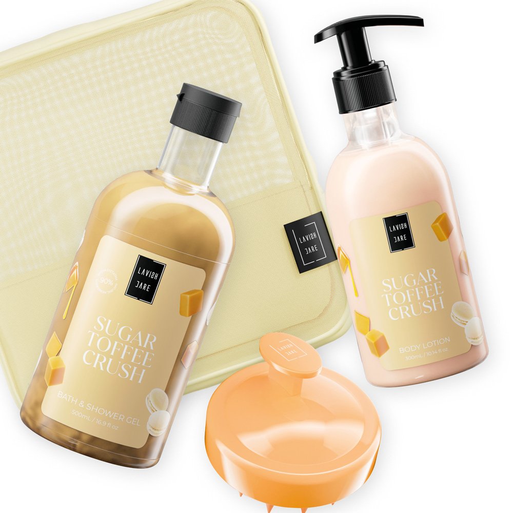 Lavish Care Комплект Sugar Toffee Crush – Подаръчен комплект чанта за грижа за тялото Комплект за грижа за тялото с тоалетна чанта