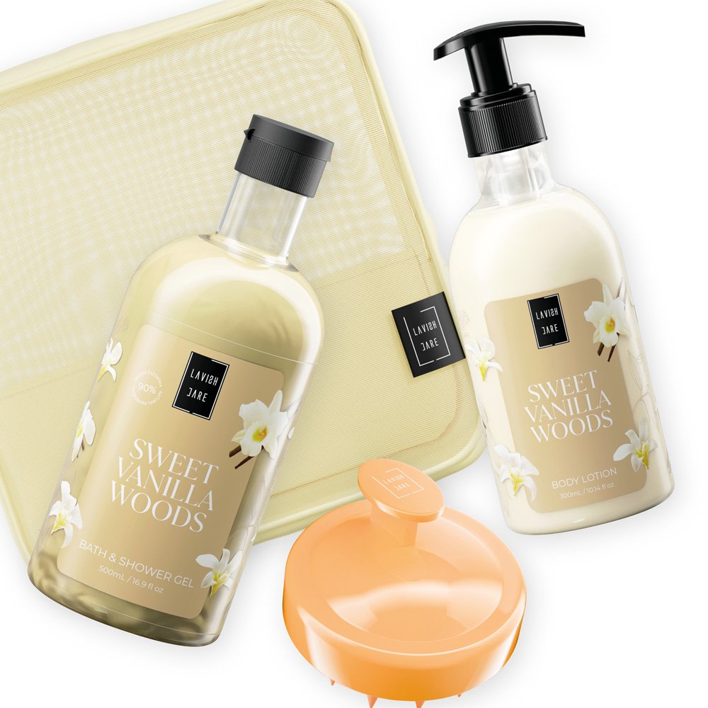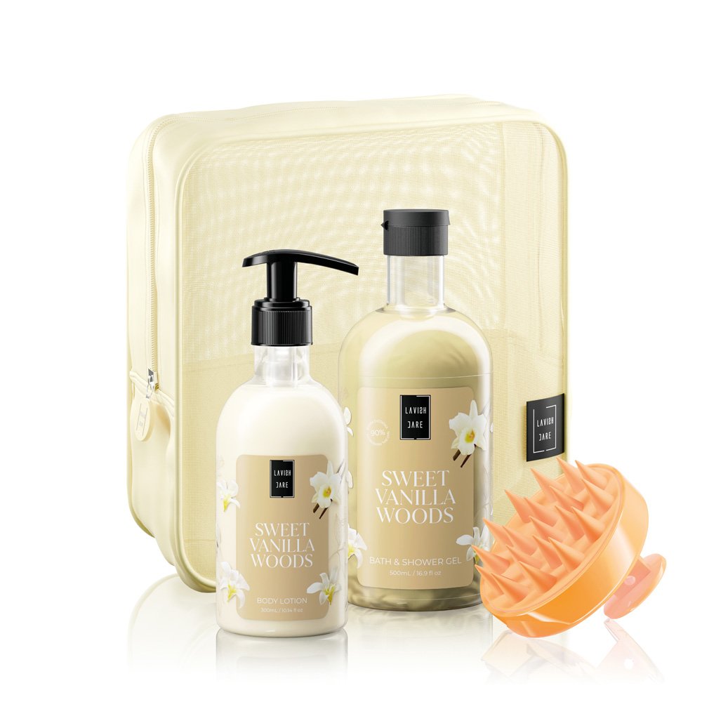 Lavish Care Комплект Sweet Vanilla Woods С Аромат Сладка Ванилия – Подаръчен комплект чанта за грижа за тялото Комплект за грижа за тялото с тоалетна чанта