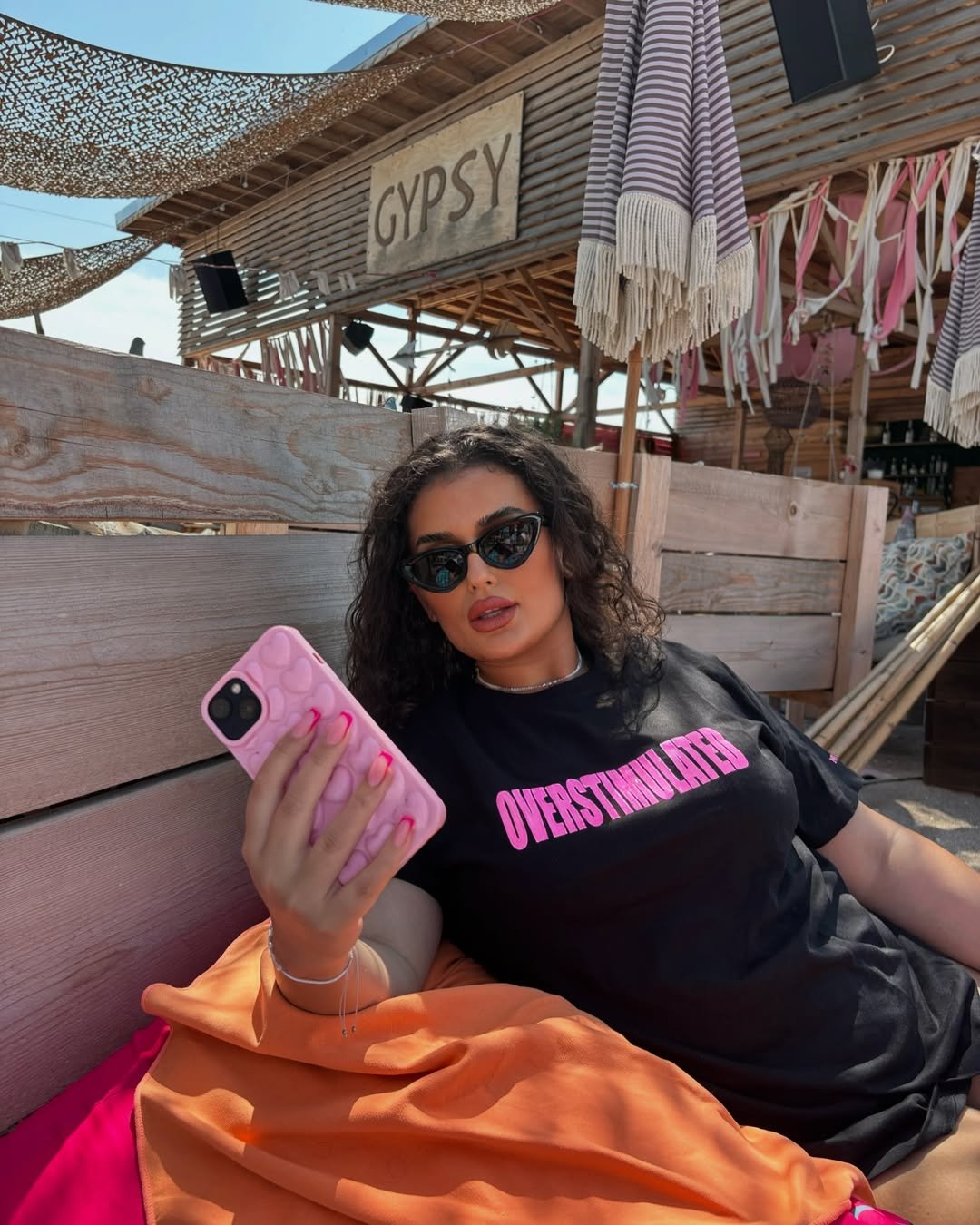 Памучна тениска с брокатен надпис „OVERSTIMULATED“ MacaronX